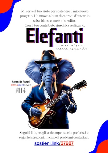 Ideato da Antonello Anzani — musicista, scrittore e presidente dell’Associazione Culturale Pagina 114 —, Elefanti è al tempo stesso un album in lavorazione, una campagna di crowdfunding attiva fino al 30 luglio, e un manifesto sociale che parla di comunità, memoria e dignità. Concreta e politica, nel senso più nobile del termine.