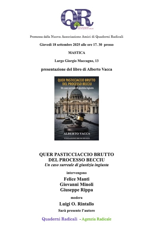 Promossa dalla Nuova Associazione Amici di Quaderni Radicali Giovedì 18 settembre 2025 alle ore 17.30  presso MASTICA (Largo Giorgio Maccagno, 13) presentazione del libro di Alberto Vacca “QUER PASTICCIACCIO BRUTTO DEL PROCESSO BECCIU Un caso surreale di giustizia ingiusta".