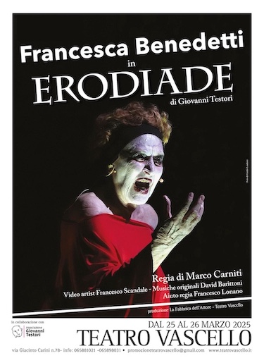 Dopo una carriera lunga e ricca di successi, l'attrice Francesca Benedetti annuncia il suo addio al palcoscenico con l'ultimo spettacolo Erodiade di Giovanni Testori, che andrà in scena il 25 e 26 marzo al Teatro Vascello di Roma. L'attrice, vincitrice del Premio Flaiano 2024, è una delle figure più apprezzate del teatro italiano. Ha conquistato il pubblico e la critica con la sua straordinaria capacità di interpretare ruoli intensi e variegati. Con una carriera che spazia dal teatro classico alla contemporaneità, la Benedetti ha segnato ogni sua performance con una passione e un'immedesimazione unica…