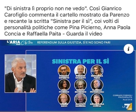 Non lo sarebbero, ad onta delle loro storia, anche gli esponenti di area progressista che si sono espressi a favore della riforma. Ce lo dice il prezzemolino del circo mediatico di La7, Gianrico Carofiglio. L’ex magistrato, già senatore del Pd, oggi scrittore dedito alla vanità, si è messo a dispensare patenti di idoneità, affermando di “non vedere persone di sinistra” tra alcuni che votano Sì, come Enrico Morando, Stefano Ceccanti, Claudio Petruccioli, Cesare Salvi, Anna Paola Concia, Augusto Barbera…