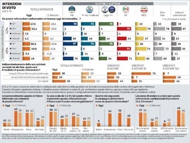 Lo scenario descritto dall’autore poggia su una duplice constatazione: da un lato, a favorire il NO sarebbe una partecipazione attestata al 42%, che scaturirebbe da un ridotto interesse degli elettori per il tema; dall’altro, il SI sarebbe penalizzato dalla maggiore mobilitazione delle opposizioni rispetto ai partiti sostenitori della riforma